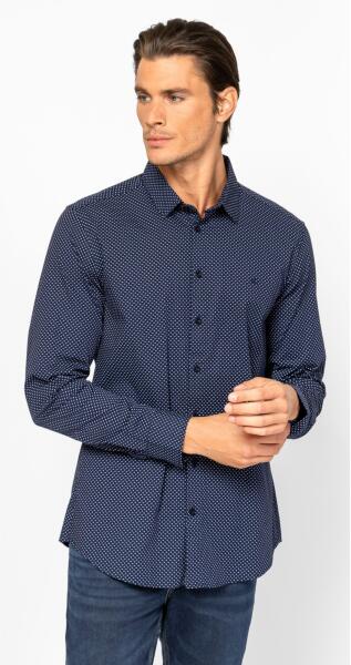 Férfi hosszú ujjú ing, shaped-fit fazonnal, apró mintás anyagból, szépen kidolgozott, gallér megoldással, elején kis hímzett márkajelzéssel és gombos mandzsettával. A rugalmas pamut anyag kellemes érzetet biztosít akár egész napos viselet során is. Anyaga: 97% pamut, 3% elasztán, puplin. A modell 188 cm magas és L-es méretet visel.